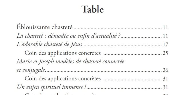 La chasteté, un don qui rend sa beauté à la sexualité, Gabrielle Vialla, éd. Artège, est paru ! Voici le plan du livre : Éblouissante chasteté p. 11 La chasteté : démodée ou enfin d’actualité ?L’adorable chasteté de JésusMarie et Joseph modèles de chasteté consacrée et conjugale.Un enjeu spirituel immense !Sainteté et chastetéChasteté et corps féminin…